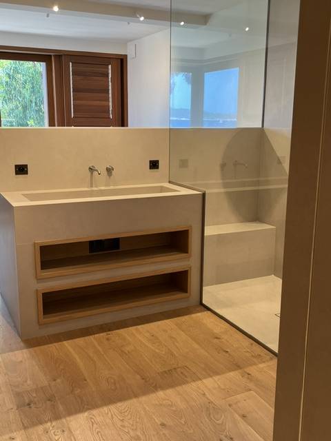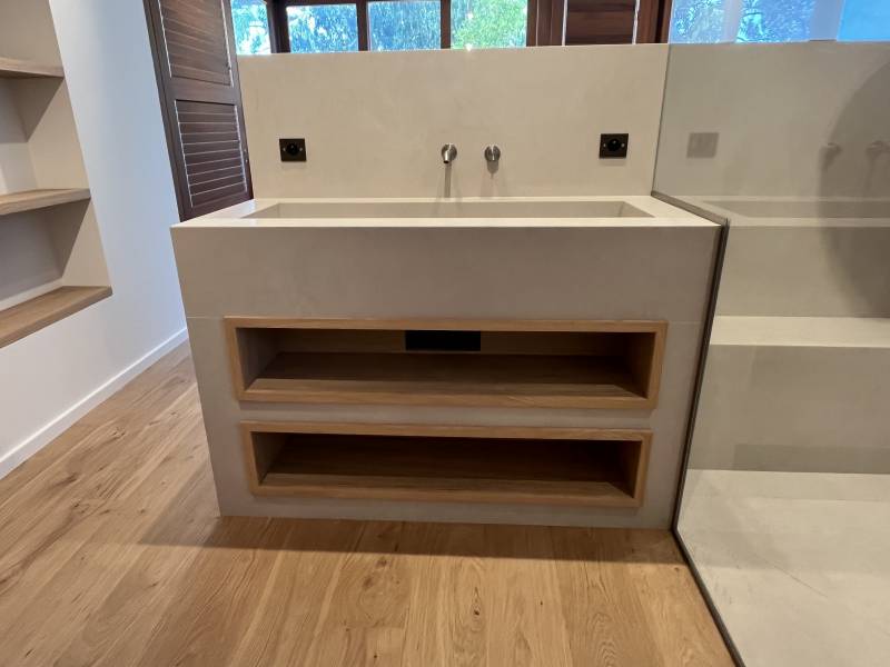 Nos menuiseries ont également conçu et posé deux caissons niches sur mesure en Chêne sablé dans le meuble de salle de bain.