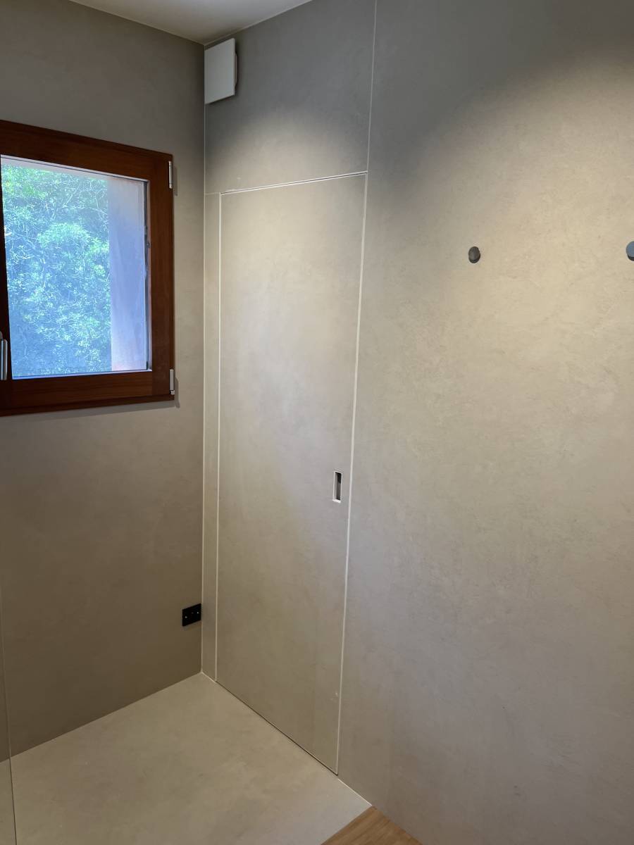 La fabrication et la pose d'une porte sur mesure avec une face intérieure en habillage carrelage et une face extérieure en Tulipier massif pour une dissimulation parfaite.